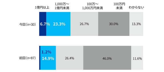 本調査では、回答企業の11.6%が、「過去1年間にサイバー攻撃で何らかの業務上の被害があった」と回答しています。また、サイバーインシデントによる被害額が「1億円以上」と回答した企業が、2022年に行った前回の調査の1.2%から6.7%に増加し、「1,000万円〜1億円未満」でも14.9%から23.3%に大幅に増加しており、被害額が高額化の傾向にあることがうかがえます。