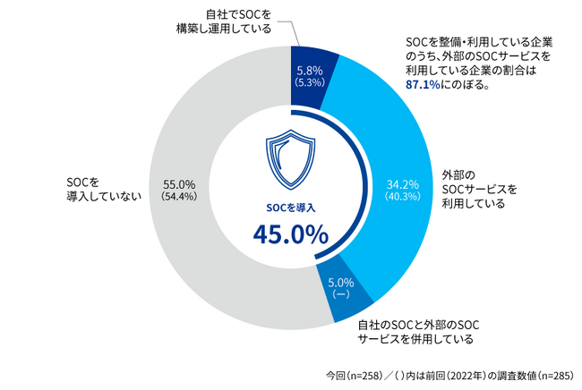 今回の調査では、最高情報セキュリティ責任者(CISO)やサイバーセキュリティ責任者を設置していると回答した企業は60.9%にとどまりました。また、セキュリティ・オペレーション・センター(SOC)を導入していない企業は回答企業の半数以上の55.0%にのぼり、CSIRT(Computer Security Incident Response Team:セキュリティ事故対応チーム)を設置していない企業は72.7%にのぼるなど、セキュリティインシデントの発生に備えた体制の整備については改善の余地が残っていることがうかがえます。