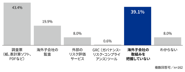 近年、海外を含めた子会社を経由したサイバー攻撃が増えるなか、今回の調査では、39.1%の企業が「海外子会社のセキュリティ対策の取組みを把握していない」と回答しており、子会社における取組みの実態の把握が求められます。また、海外子会社のセキュリティ対策状況の把握方法については、43.4%が「調査票」と回答し、「監査」と「外部のリスク評価サービス」は19.9%と8.0%にとどまり、今後外部サービスの活用やGRC(ガバナンス・リスク・コンプライアンス)ツールの活用が望まれます。