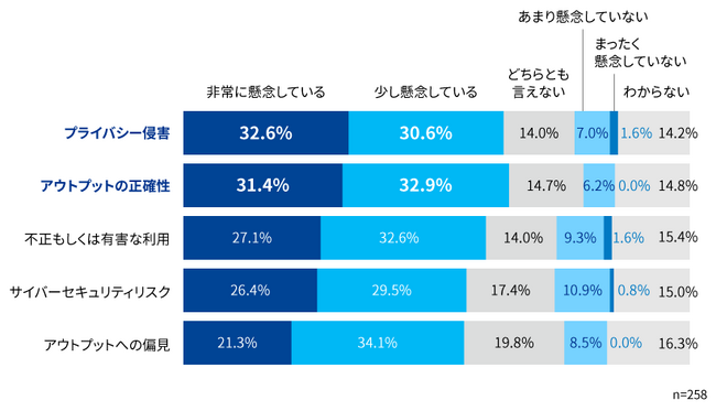 AIの導入に係るリスクにおいては、「プライバシー侵害」と「アウトプットの正確性」について「非常に懸念している」と「少し懸念している」を合わせると60%を超える一方、AIリスクを管理する組織やルール、プロセスについて「整備済み」と回答した企業は4.3%にとどまり、AIリスク管理の整備が遅れている状況が明らかになりました。