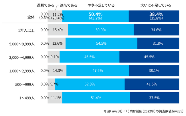 サイバーセキュリティ予算については、回答企業の68.2%が「不足している」と回答しています。特に、従業員数が1,000人未満の企業でその傾向が強く、サプライチェーンを構成する中小企業などの取引先におけるサイバーセキュリティ対策に影響をあたえることが懸念されます。さらに、サイバーセキュリティ人材については、88.8%の回答企業が「不足している」と回答しており、この傾向は従業員規模にかかわらず、前回の調査よりも増加しています。