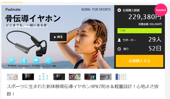本日、おかげさまで、公開2時間で新品「Padmate骨伝導イヤホン」は達成率110%、支援総額22万円を突破しました!!