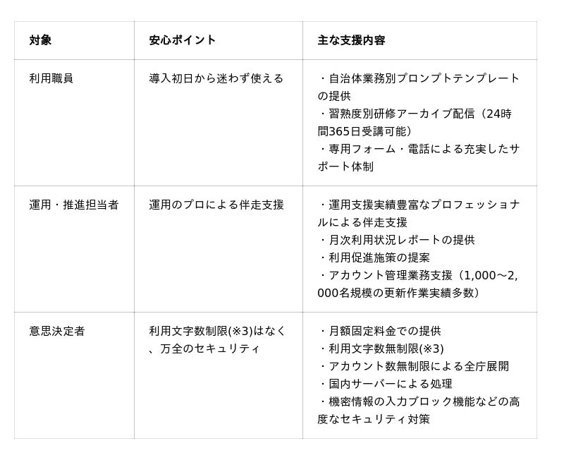 - 使い放題言語モデルを標準搭載:文字数上限を気にせず、全職員の積極的なAI活用を促進(※3)