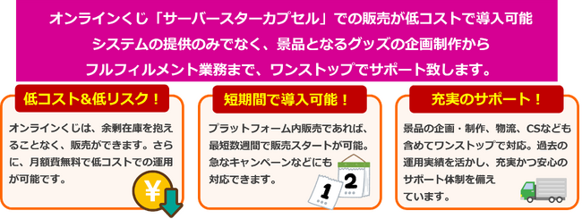 「サイバースターカプセル」は、実店舗や会場へ足を運ばずに、サイト内で購入したコインを消費し、オンライン上でカプセルを回して、その場で当選した景品を知ることができるといった、自らが商品を選択し購入する場合とは異なり抽選形式でしか味わえない独特の高揚感を感じることができるオンラインくじです。