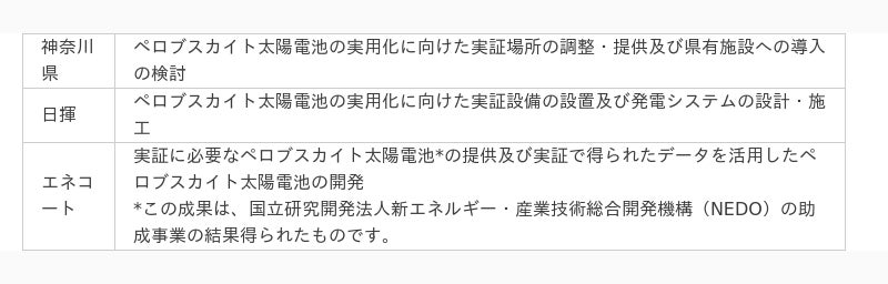 このたび神奈川県、日揮およびエネコートが締結した「脱炭素化促進のためのペロブスカイト太陽電池の普及に関する連携協定」の内容は次のとおりです。