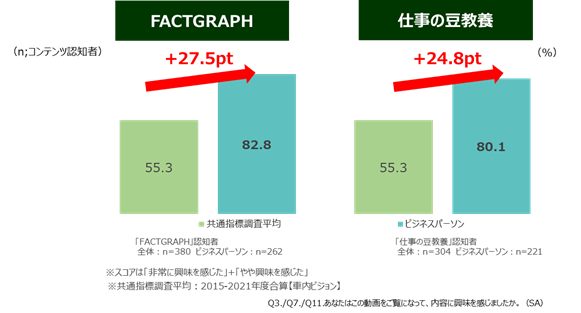 コンテンツの興味関心は8割を超え、通常の広告(交通広告共通指標策定調査における興味関心度)と比較し25ポイント程度上回る結果となりました。「ひと駅、ひと学び」のコンセプトのもと、トレインチャンネルで完結するコンテンツが、認知者の興味関心を獲得できた要因であると考えられます。※図1