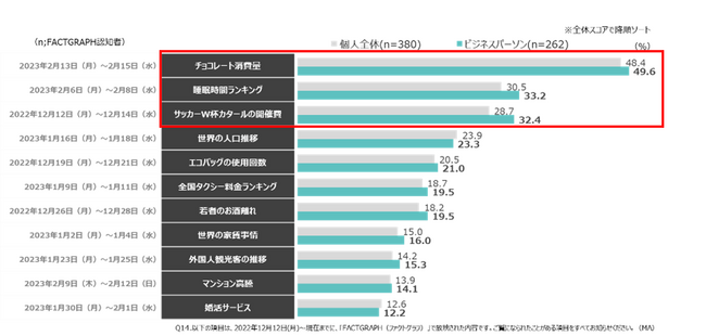 クリエイティブ認知は、バレンタイン時期に放映した「チョコレート消費量」のテーマが5割程度と最も高く、「睡眠時間ランキング」、「サッカーW杯カタールの開催費」が3割程度で続きました。イベント事との親和性の高さや、旬なトピックスに関するテーマの認知が高い傾向がありました。※図3