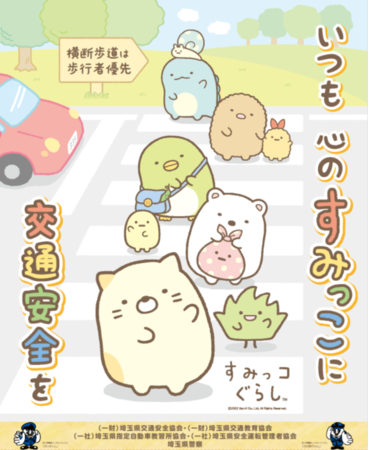 埼玉県警察による秋の全国交通安全運動(9月21日〜9月30日)の実施に伴い今年で10周年を迎える「すみっコぐらし」が「埼玉県警察交通安全広報アンバサダー」に委嘱され、今後も埼玉県内の交通安全対策の啓発として、アンバサダーを務めていきます。