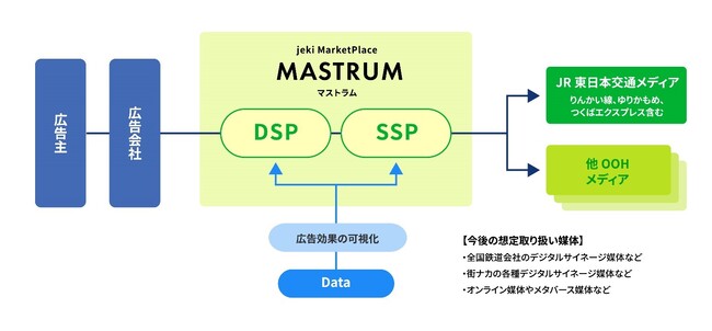 株式会社ジェイアール東日本企画(本社:東京都渋谷区、代表取締役社長:赤石 良治)はDSP/SSPを通じて国内全般のOOHメディアを対象にした取引を可能とするプラットフォームを構築し、jekiオリジナルのマーケットプレイスブランド「MASTRUM*1(マストラム)」としてサービス開始に向けて具体的取組みをスタートします。