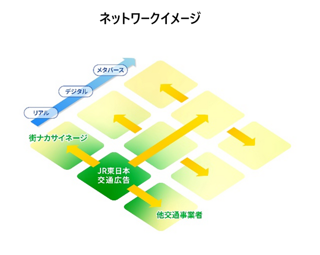 今後の想定取り扱い媒体としてはJR東日本の枠組みを超え他電鉄や街ナカサイネージへ領域を拡げ、さらにオンライン&バーチャル領域と連携、シームレスにネットワーク化していく予定です。