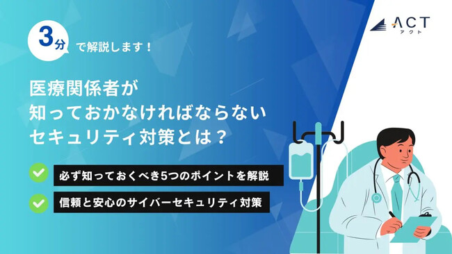 今年30周年を迎え、サイバーセキュリティ事業などを行う株式会社アクト(本社:東京都文京区、代表取締役CEO 小林 智彦 、以下 アクト)は【3分で解説!医療関係者が知っておかなければならないセキュリティ対策とは?】のホワイトペーパーを公開しました。