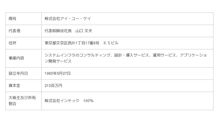 株式会社アイ・ユー・ケイは、TISインテックグループの中核企業である株式会社インテックの主要子会社です。アイ・ユー・ケイは、システム・ソリューション・プロバイダーとして、安全で安心できる、最適なユースウェアを含むソリューションとサービスを提供いたします。1.高い目標に挑戦する人財の育成と蓄積、2.先進的技術の利用と絶えざる事業開発、3.お客様と信用の蓄積、これらを通じて、創造的な企業活動を展開し、お客様と共に前向きに挑戦し、進化し、成長し続け、豊かで幸せな社会の実現に貢献いたします。