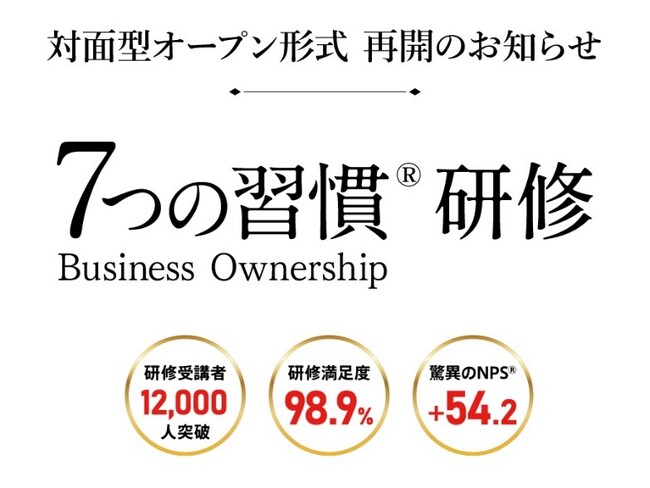 「7つの習慣(R) Business Ownership研修」は新型コロナウイルスの影響を鑑み、2020年度よりオンラインでの開催を継続してきました。そうした中でも多くの方にご支持いただき、研修受講者数12000人突破、研修満足度98.9%、そして顧客推奨度を示すNPSは+54.2という高い評価をいただいて参りました(※2)。