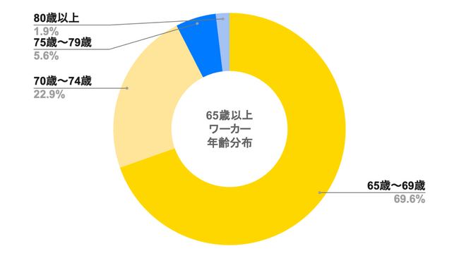 65歳以上の働き手の年齢分布は図のようになっており、65歳〜74歳の働き手で92.5%いますが、75歳以上の働き手も7.5%いることがわかり、シニアの中でも多様な年齢層の方にご利用いただいている実態がわかりました。