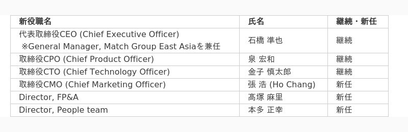 ・CEOである石橋は、引き続き当社親会社である米国Match Groupのグローバル・リーダーシップ ( https://mtch.com/leadership ) の一員としてGeneral Manager of Match Group East Asiaを兼任し、東アジアで展開する全事業の成長と拡大を牽引します。