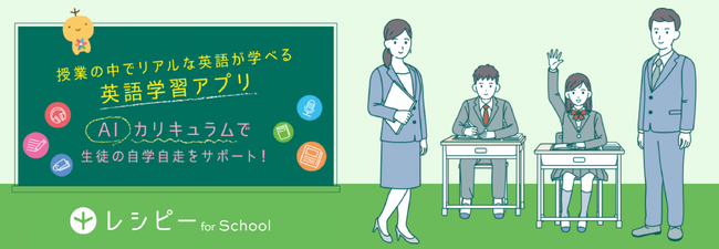 ・6技能全てを網羅した英語学習アプリ「レシピー」を利用した総合的な英語力の向上・AIにより、学習履歴や他学習者の成果の出た学習プロセスを分析し、一人一人に合わた日々の学習カリキュラムを生成