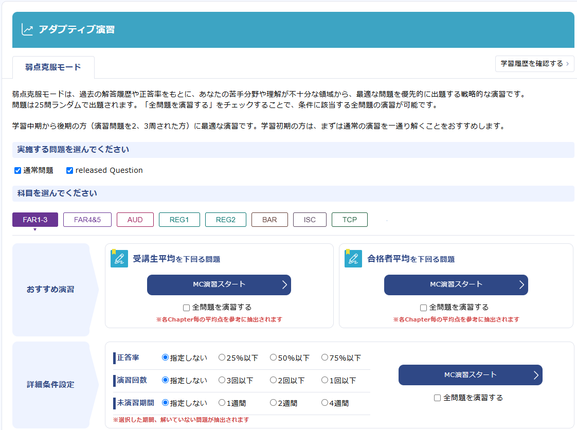 USCPA試験対策のために受講生は多量の問題演習を行う必要がありますが、従来は受講生自身がその中から自らの弱点を見極め、対策を立てる必要がありました。そこでアビタスは、「Abitus Intelligence」の中核となる長年蓄積してきた日本人合格者の分析データと学習ログを融合し、弱点克服を目的とするアダプティブラーニング機能を独自に開発しました。本機能では、受講生一人ひとりの学習データをもとに最適な問題演習を提示します。正答率、演習回数、演習期間などを組み合わせて選択することで効率的に学習できるほか、おすすめ演習として日本人合格者データをもとにした「受講生平均を下回る問題」「合格者平均を下回る問題」を用意しており、受講生が効率的かつ効果的に弱点克服ができるようになり、より短期間での合格実現を目指すことができます。