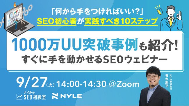 「ナイルのマーケティング相談室」を運営するナイル株式会社(本社:東京都品川区、代表取締役:高橋 飛翔、以下、ナイル)は、9月27日(火)14:00より、月間1,000万UUの自社事例を紹介しながら、SEO初心者が実践すべき10ステップを解説する「すぐに手を動かせるSEOウェビナー」を無料開催いたします。