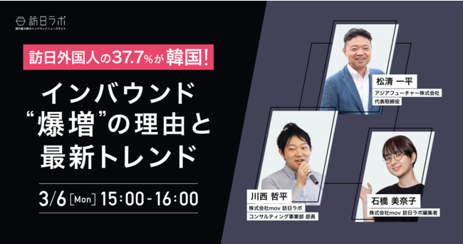 国内最大級のインバウンド総合メディア「訪日ラボ」を運営する株式会社mov(代表取締役:渡邊 誠、本社:東京都渋谷区、以下mov)は、インバウンド関連事業者様向けのセミナー「訪日外国人の37.7%が韓国!インバウンド "爆増" の理由と最新トレンド」を開催いたします。日程は3月6日(月)15:00〜16:00、参加費は無料です。
