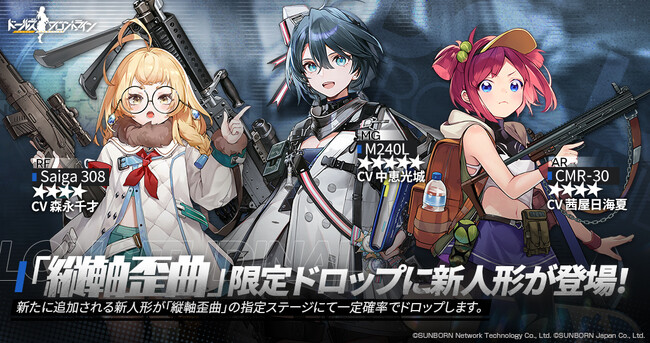 「縦軸歪曲」の特定ステージにて、限定新人形の★5 MG「M240L(CV:中恵光城)」、★4 RF「Saiga 308(CV:森永千才)」、★4 AR「CMR-30(CV:茜屋日海夏)」に加え、過去の限定人形が一定確率でドロップします。