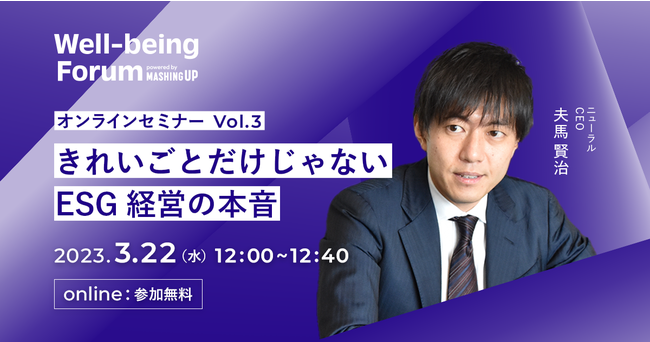 企業のDE&I促進と、ESG学習・情報発信をサポートする一般社団法人MASHING UP(運営:株式会社メディアジーン/東京都渋谷区)は、2023年3月22日(水)に、オンラインセミナー「きれいごとだけじゃない。《ESG経営》の本音」(https://eventregist.com/e/forum_seminar_vol3)を開催します。
