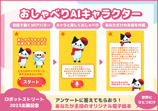このような考えに基づき、今回はまずそのトライアルとして、当社の強みとするIP事業や知育・絵本事業に関連したAIサービスを、ATCロボットストリート2023にて展示することにいたしました。