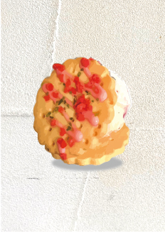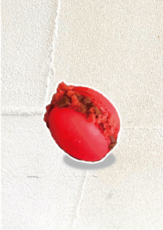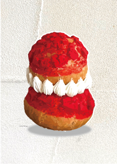 大小のシュー生地を重ねたルリジューズ。上のシュー生地にはピスタチオクリーム、下のシュー生地にはいちごカスタードが入っており、2種類の味をお楽しみいただけます。