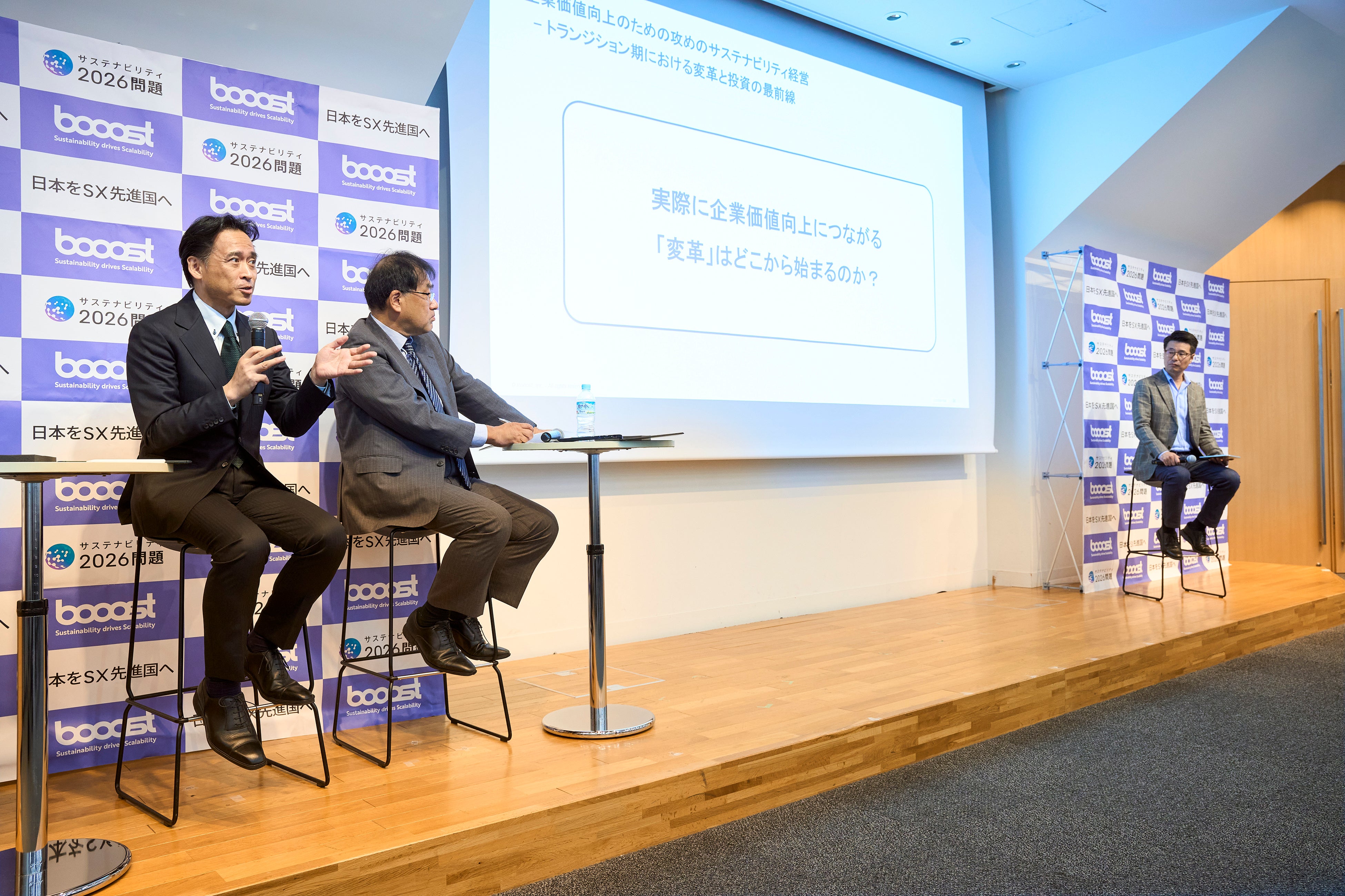 パネルディスカッションでは、アセットマネジメントOneの寺沢徹氏、ボストン コンサルティング グループの半谷陽一氏、Booost 取締役の大我猛が登壇し、「攻めのサステナビリティ経営」の実践と、それを支える投資・戦略のあり方について意見を交わしました。