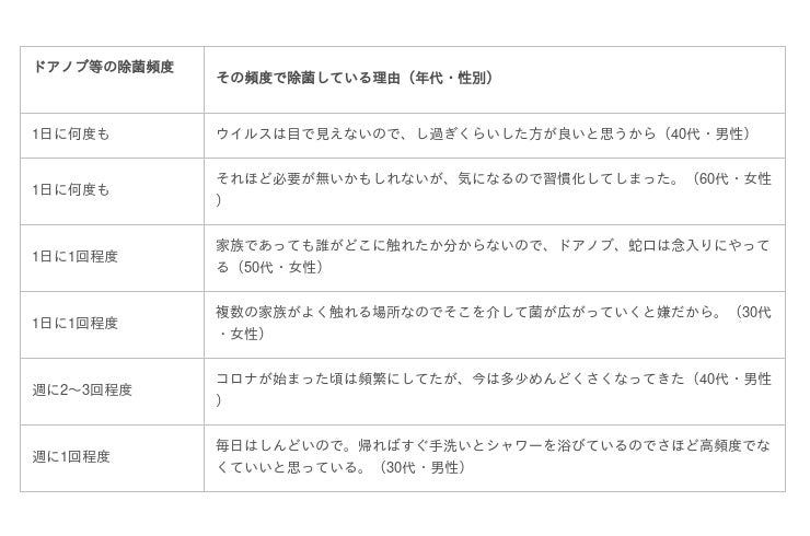 意識が高まりました。コロナ禍前から外出後の手洗い、消毒液使用は行っていましたが、コロナ禍以降は玄関に消毒液を置くなど、除菌への意識がより高まりました。(50代・男性)