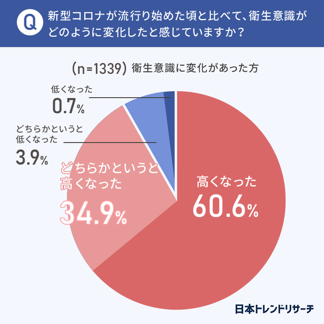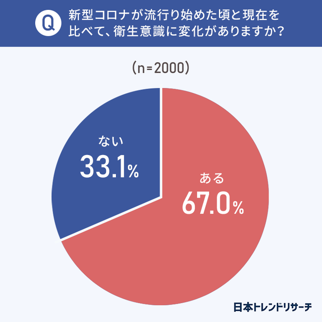 新型コロナが流行り始めた頃と比べて、衛生意識がどのように変化したと感じているかについても聞きました。