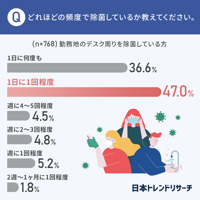 自宅のドアノブや勤務地のデスクなどの除菌頻度は、「1日に何度も」や「1日に1回程度」と回答した方が多くいました。