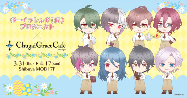 キャラクターグッズの商品企画・製作・販売を行う中外鉱業株式会社コンテンツ部は、「ボーイフレンド(仮)プロジェクト× Chugai Grace Cafe」を開催いたします。当イベントは2022年3月31日(木)〜4月17日(日)まで渋谷モディ7F Chugai Grace Cafeにて開催となります。