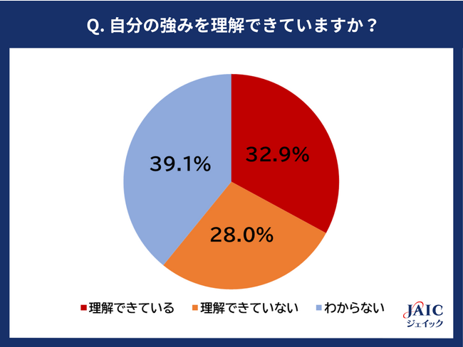 「自分の強みを理解できていますか?」と質問したところ、1位「わからない」(39.1%)、2位「理解できている」32.9%、3位「理解できていない」(28.0%)となりました。