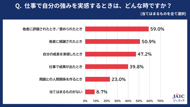 「仕事で自分の強みを実感するときは、どんな時ですか?」(複数回答可)と質問したところ、1位「他者に評価されたとき/褒められたとき」(59.0%)、2位「他者に感謝されたとき」(50.9%)、3位「自分の成長を実感したとき」(47.2%)、4位「仕事で成果が出たとき」(39.8%)、5位「周囲との人間関係を作るとき」(23.0%)、6位「当てはまるものがない」(8.7%)となりました。