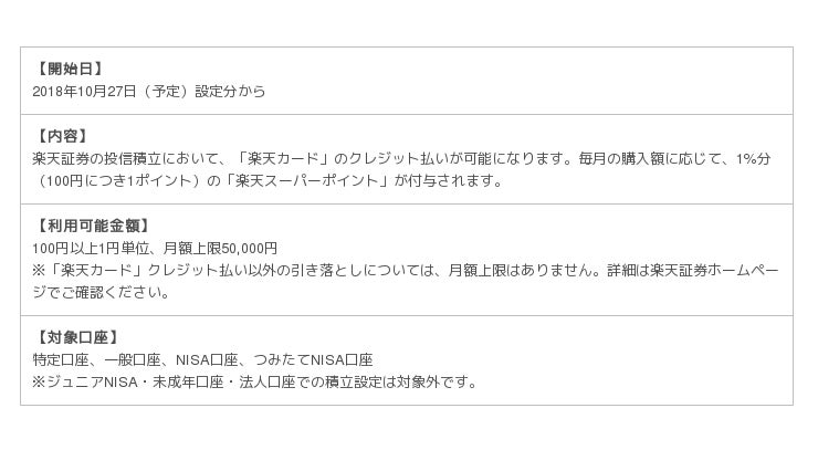 楽天証券株式会社(代表取締役社長:楠 雄治、本社:東京都世田谷区、以下「楽天証券」)と楽天カード株式会社(代表取締役社長:穂坂 雅之、本社:東京都世田谷区、以下「楽天カード」)は、2018年10月27日(予定)より、「楽天カード」※1のクレジット払いでポイント還元を受けながら、投資信託の積立ができるサービスを提供することをお知らせします。これにより、「楽天カード」ご利用時のお買い物と同様に、毎月の購入金額の1%分(100円につき1ポイント)、「楽天スーパーポイント」が貯まります。