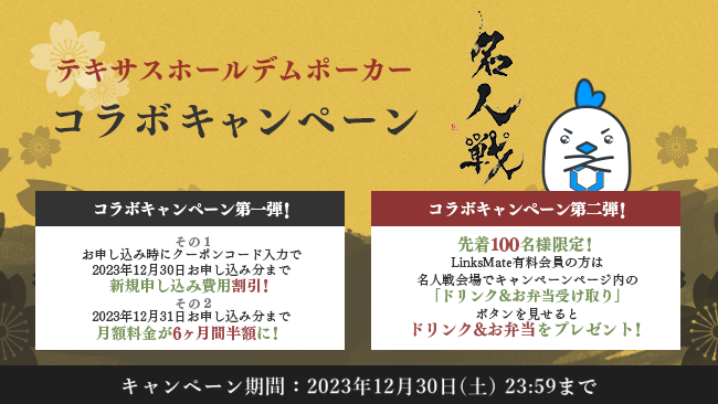 2023年12月30日(土)まで、「テキサスホールデムポーカー 名人戦コラボキャンペーン」として、お得なキャンペーンを行なってまいります。