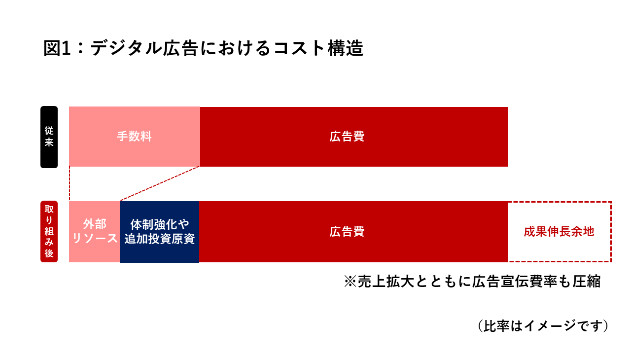 - デジタル広告運用のスキームを、手数料型からリソース型へ移行。手数料はリソース費として固定化。コストを削減し、さらなる成果創出や体制強化などの投資原資に充当。