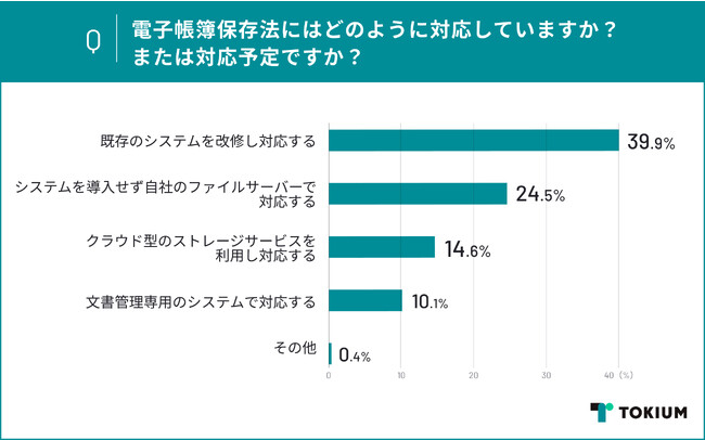 「電子帳簿保存法にはどのように対応しているか、または対応予定か」という質問に対し、最も多いのは「既存のシステムを改修し対応する」が39.9%でした。その他、「文書管理専用のシステムで対応する」が10.1%、「クラウド型のストレージサービスを利用し対応する」が14.6%とシステムで対応する企業が多いことが分かりました。一方で、24.5%が「システムを導入せず、自社のファイルサーバー保存で対応する」と回答しており、システムを利用せずに対応する企業も一定数いることがわかりました。