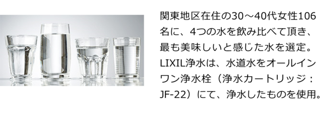 30〜40代女性に、LIXIL浄水・国内製ペットボトル水・海外製ペットボトル水・水道水の飲み比べを実施したところ、「LIXIL浄水が最もおいしい」という回答をいただきました。