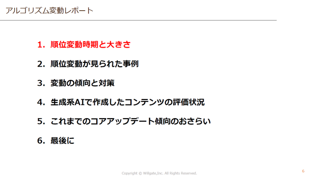 ウィルゲートはSEOコンサルティングサービスなどのSEO関連のサービスを15年以上提供しています。本レポートでは、11月のGoogleアルゴリズム変動についての見解・仮説に加えて、生成系AIで作成したコンテンツの評価状況などもまとめています。