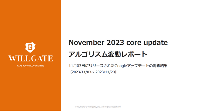株式会社ウィルゲート(本社:東京都港区、代表取締役:小島 梨揮、以下「ウィルゲート」)は、2023年11月3日(金)にGoogleからリリースされたアルゴリズムアップデート(November 2023 core update)の情報をレポートにまとめ、無料公開しました。前回の速報版の情報に加え、詳細な分析と仮説や対策を加えたレポートとなっています。