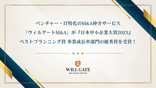 ベンチャー・ITに特化した完全成功報酬型のM&A仲介サービス「ウィルゲートM&A」が『日本中小企業大賞2023』ベストプランニング賞 事業成長率部門の優秀賞を受賞!