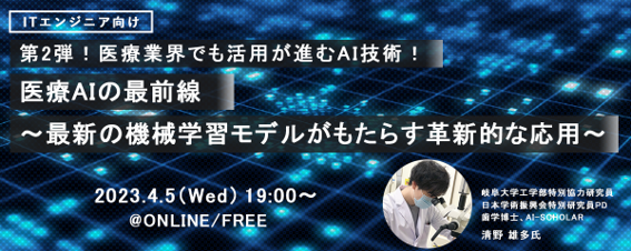ITエンジニアの新しい働き方を提案する株式会社PE-BANK(東京都港区/代表取締役 高田 幹也)は、2023年4月5日(水)19時より、ITエンジニア向けオンラインセミナー『医療業界でも活用が進むAI技術!!医療AIの最前線〜最新の機械学習モデルがもたらす革新的な応用〜』を開催いたします。