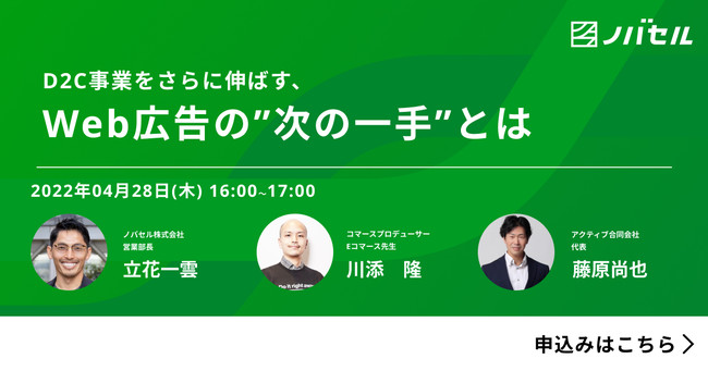 運用型テレビCMサービスを運営する、ラクスルグループのノバセル株式会社(本社:東京都品川区、代表取締役社長:田部正樹、以下ノバセル)は、川添隆氏(コマースプロデューサー、Eコマース先生)と藤原尚也氏(アクティブ合同会社、代表)をゲストに迎え、『D2C事業をさらに伸ばす、Web広告の次の"一手"とは』をテーマにオンラインセミナーを4月28日(木)に開催いたします。参加登録URL:https://novasell.com/seminars/220428