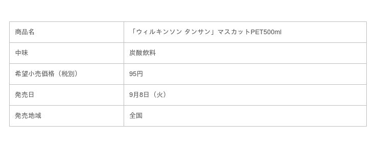 アサヒ飲料株式会社(本社 東京、社長 米女 太一)は、「『ウィルキンソン タンサン』マスカット」PET500mlを2020年9月8日(火)より全国発売します。