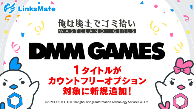 株式会社LogicLinks(以下LogicLinks、本社:東京都渋谷区、代表取締役社長:春田康一)は、MVNOサービス「LinksMate」において2024年4月18日(木)よりカウントフリーオプション対象コンテンツとして合同会社EXNOA(本社:東京都港区、CEO:村中 悠介)が提供するオンラインゲームプラットフォーム『DMM GAMES』にて配信中の「俺は廃土でゴミ拾い」を新たに追加することをお知らせいたします。