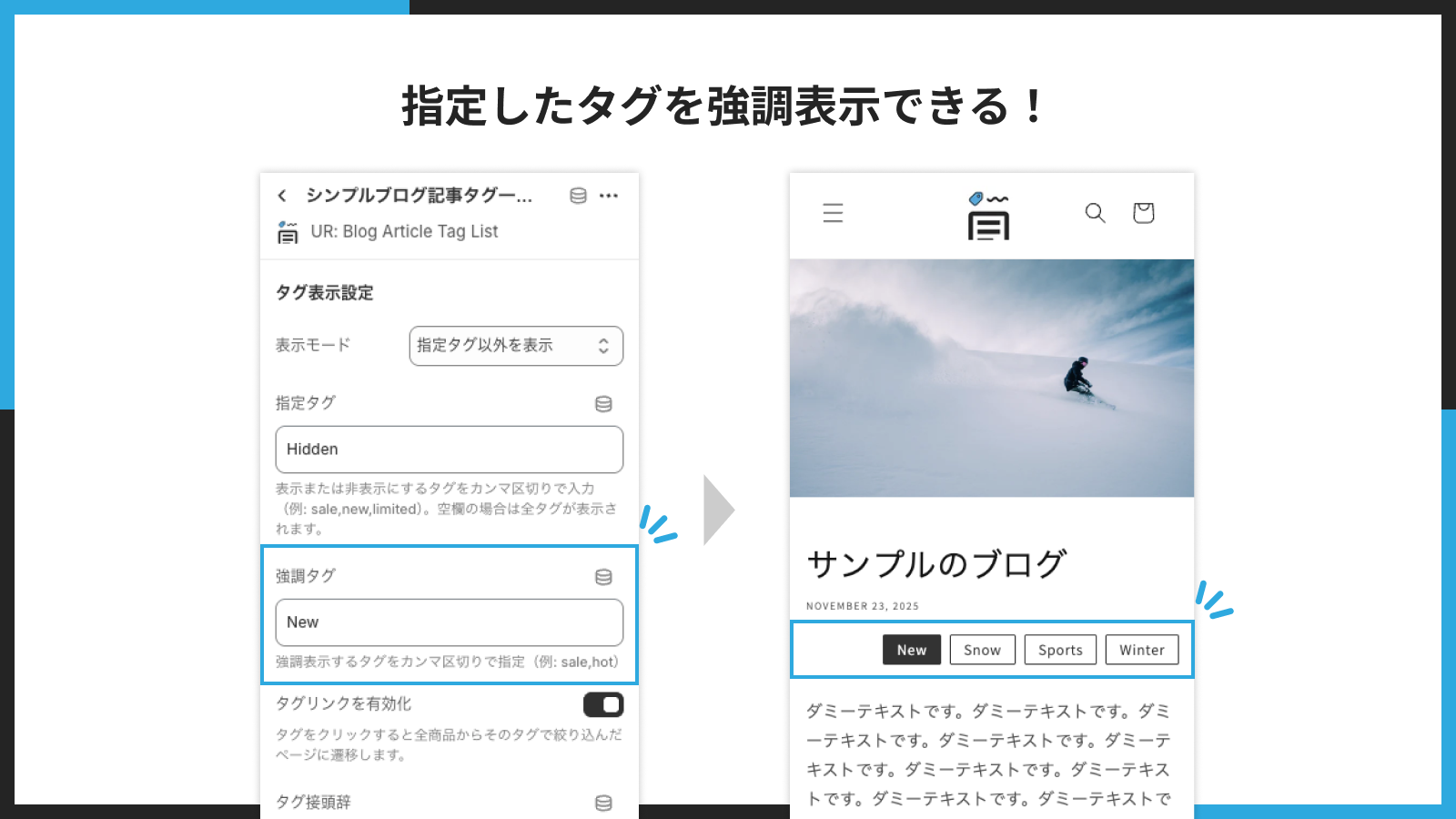 「シンプルブログ記事タグ一覧|お手軽リンク付きタグ表示設定」は、ブログ記事ページに表示するタグを “見せる・隠す・強調する” を自在にコントロールできる Shopify アプリです。