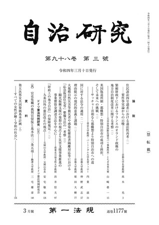 法律関連出版物、各種データベースを提供する第一法規株式会社(所在地:東京都港区、代表取締役社長:田中 英弥)は、『自治研究3月号』を2月28日に発刊しました。