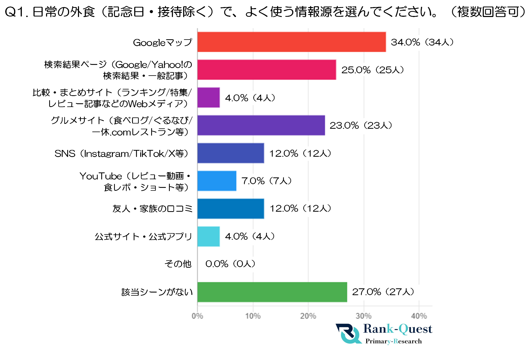 - 「該当シーンがない」以外で、最も多かったのは 「Googleマップ」(34.0%・34人) で、日常的な外食においても位置情報と連動した検索の便利さが重視されている様子が見られます。