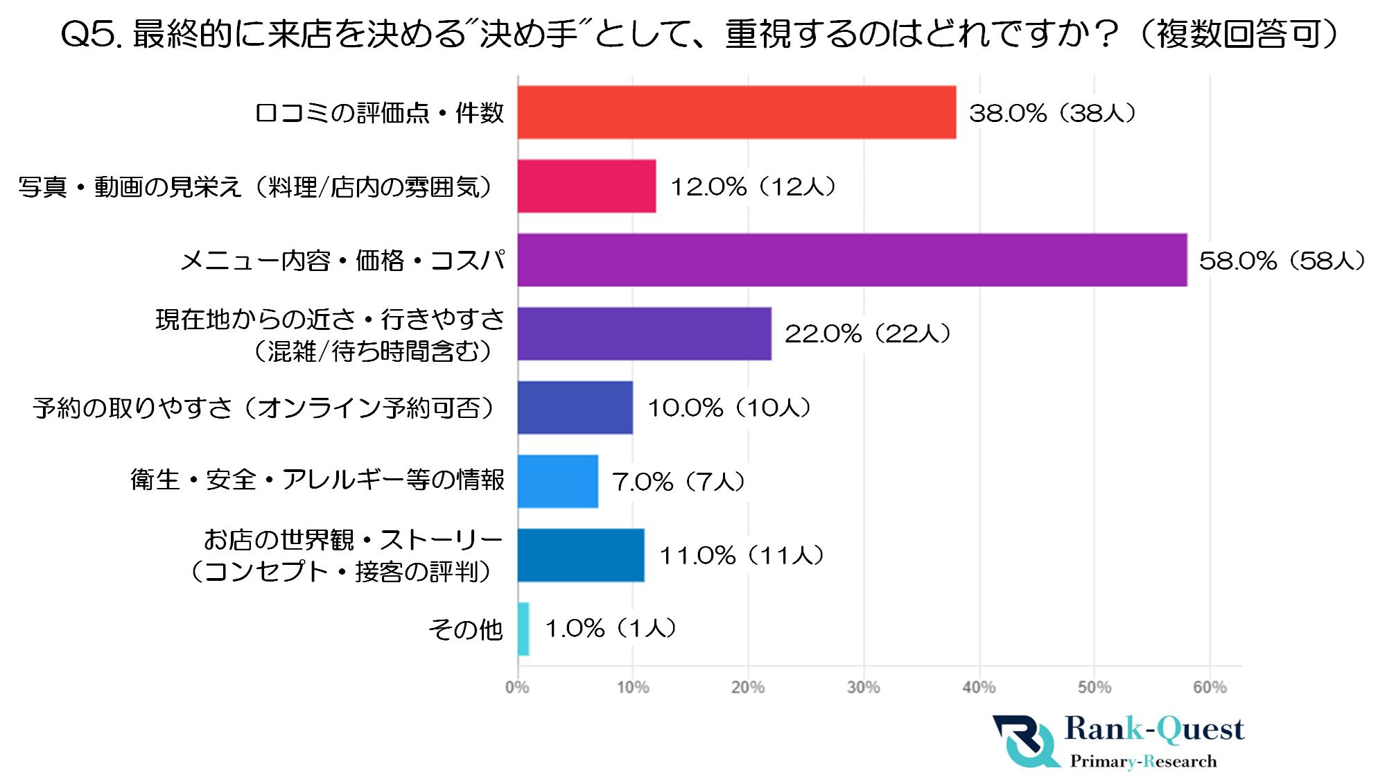 - 最も多かったのは 「メニュー内容・価格・コスパ」(58.0%・58人) で、全体の過半数を超えており、最終的な来店の決め手として料理内容や価格設定が大きく影響している様子が見て取れます。